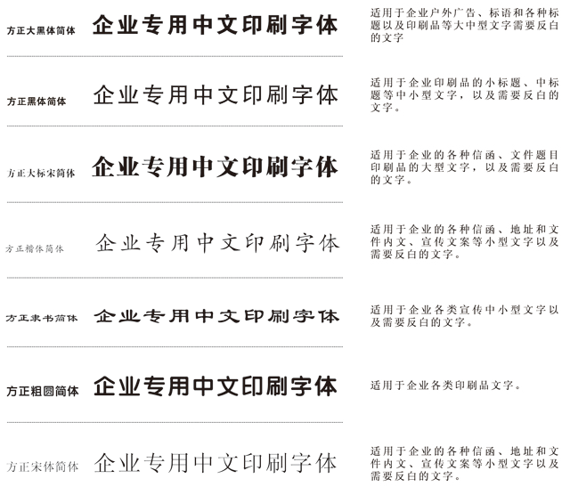 為使視覺形象更加統(tǒng)一,所有傳媒所用文字,均應(yīng)選用以下規(guī)定字體。字體允許向右傾斜20度,允許長體90%―100%,扁體110%-120%。禁止使用其他字體,特性情況(如節(jié)日、慶典)設(shè)計(jì)例外。同時(shí),為求得運(yùn)用方便,在刊物,媒體及封面的排版上,若無相同字體時(shí),可選擇字形相近的字體替代使用。