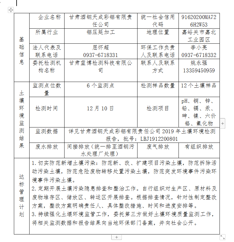 甘肅酒鋼天成彩鋁有限責(zé)任公司 土壤環(huán)境重點(diǎn)監(jiān)管企業(yè)自行監(jiān)測(cè)信息公開(kāi)表