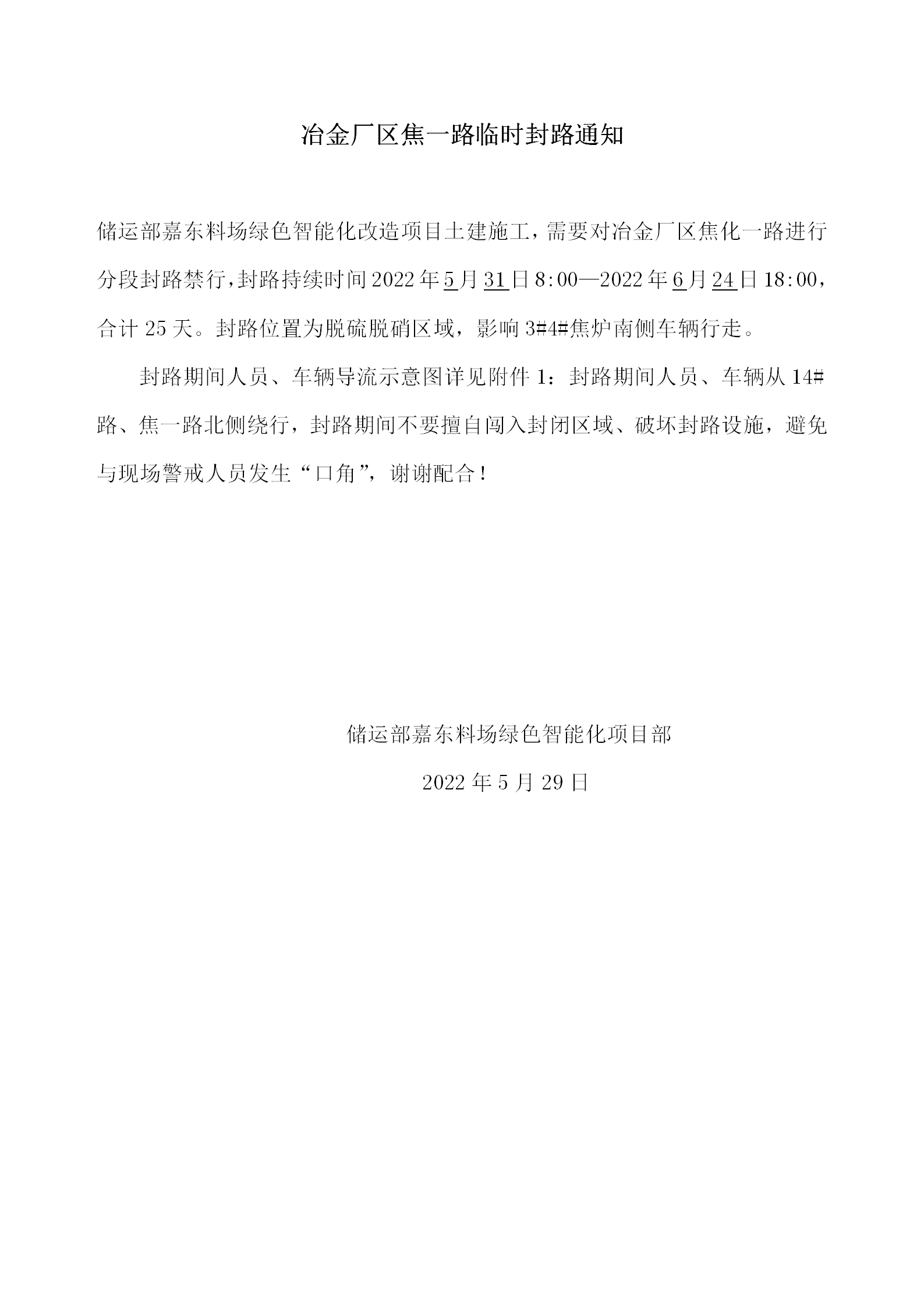 冶金廠(chǎng)區(qū)焦一路臨時(shí)封路通知