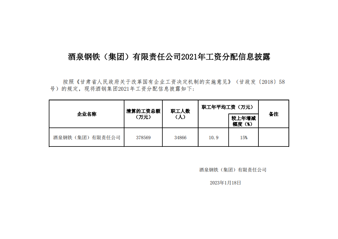 酒泉鋼鐵(集團)有限責任公司2021年工資分配信息披露