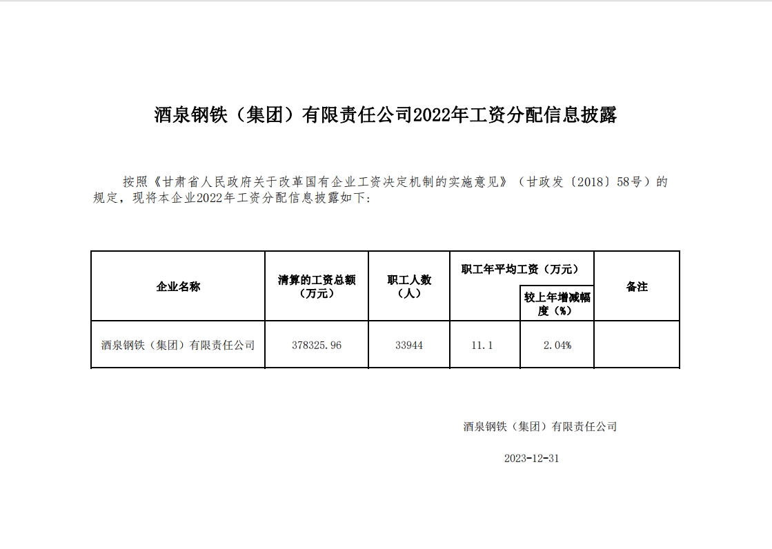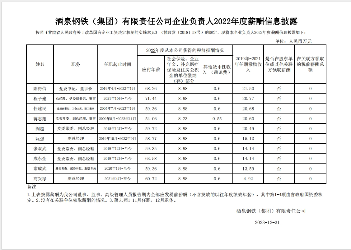酒泉鋼鐵(集團)有限責任公司2022年工資分配及企業(yè)負責人2022年度薪酬信息披露
